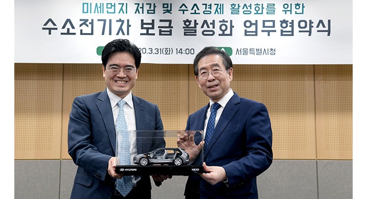현대자동차는 지난달 31일 서울시 신청사에서 현대자동차 공영운 사장과 서울시 박원순 시장 등 주요 관계자들이 참석한 가운데 수소전기차 보급 활성화를 위한 상호협력 강화를 주요내용으로 하는 양해각서(MOU)를 체결했다고 1일 밝혔다.