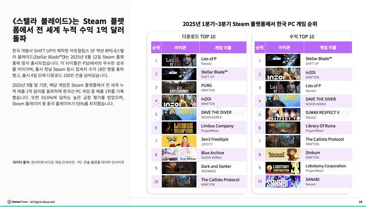한편 스팀에서 한국산 PC 게임 순위를 살펴보면 시프트업의 ‘스텔라 블레이드’는 PS5 흥행에 이어 2025년 6월 스팀 출시 후 첫날 동시 접속자 18만 명, 4일 만에 다운로드 100만 건을 돌파했다. 9월 말 기준 누적 매출 1억달러, 긍정 평가 93.6%를 기록하며 한국산 PC 게임 중 매출 1위를 차지했다.