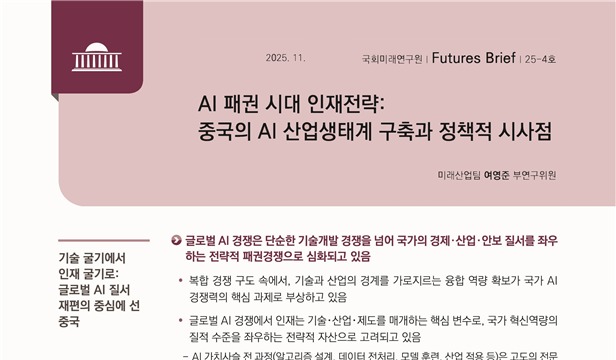 국회미래연구원(원장 김기식)은 11월 11일(화)에 “AI 패권 시대 인재전략: 중국의 AI 산업생태계 구축과 정책적 시사점” 브리프를 발간했다. 브리프는 글로벌 AI 기술 경쟁이 국가 차원의 경제·산업·안보 질서를 좌우하는 ‘전략적 패권경쟁’으로 확산되는 가운데, 중국이 지난 10여 년간 추진해온 인재 중심의 AI 산업생태계 전략을 분석하고 정책적 시사점을 도출했다.