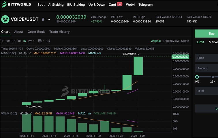 밈토큰 전문 거래소로 알려진 Bittworld 거래소가 공격적으로 밈토큰 상장을 이어가며 글로벌 투자자들의 주목을 받고 있다. 이미 ALIEN, AIT 토큰을 상장한 데 이어 새로운 인기 프로젝트인 VOICE 토큰을 추가로 상장했다.