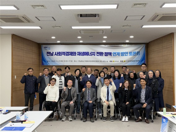 전남사회적경제통합지원센터(센터장 김태현)는 지난 11월 27일(목) 전라남도중소기업일자리경제진흥원 2층 세미나실에서 ‘전남 사회연대경제와 재생에너지 전환 정책 연계 방안 토론회’를 개최했다. 이번 토론회는 전라남도 내에서 최초로 사회연대경제와 재생에너지 전환을 연계해 공식적으로 논의한 자리라는 점에서 의미가 크다.