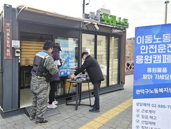 구는 오는 19일에도 관악 포레스트에서 혹한기 이동 노동자 안전지원 캠페인을 실시해 50명에게 방한용품을 추가 지급하고 배달 종사자의 겨울철 안전사고와 질병을 예방한다는 방침이다.