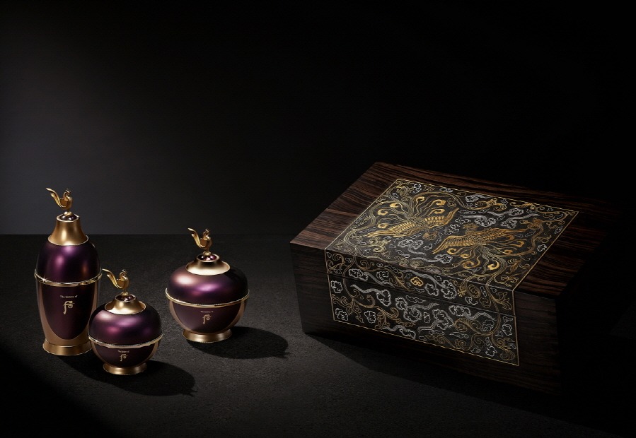 고귀한 궁중예술을 담아 화장품을 넘어 하나의 걸작으로 평가받는 '환유 국빈세트'는 올해 정교함과 화려함의 극치로 불리는 궁중 금속공예 기법, '입사(入絲)'로 완성됐으며, 역대 최고의 가치를 자랑한다.
