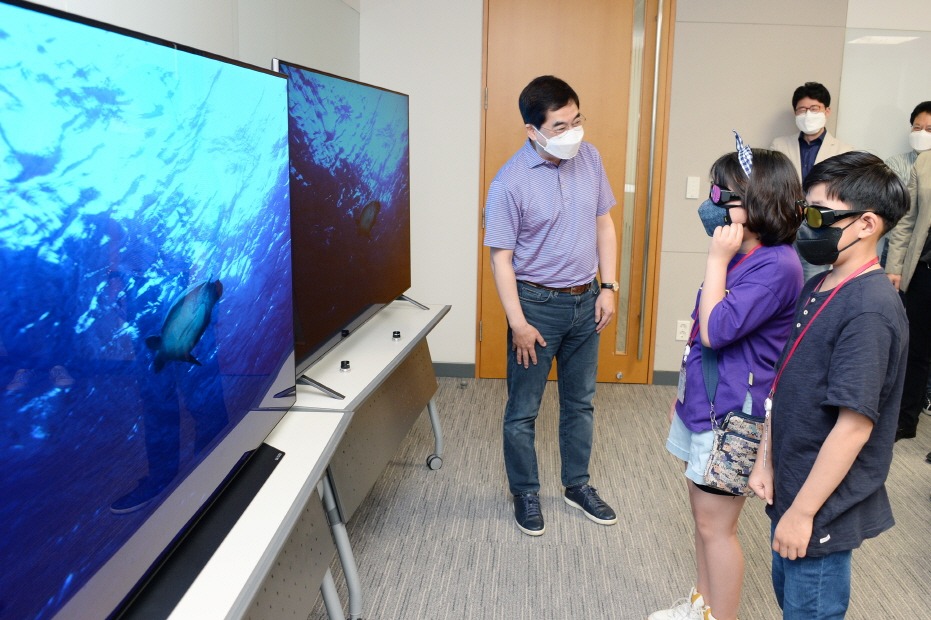 LG전자는 백라이트 유무에 따른 TV의 구조적 차이와 블루라이트에 대해 어린이 눈높이에 맞춰 알기 쉽게 설명하는 시간을 가졌다. 특히 기채영 어린이는 특수 제작된 안경을 쓰고 올레드 TV와 LCD TV에서 블루라이트가 나오는 정도의 차이를 직접 눈으로 확인하며 놀라워하기도 했다.