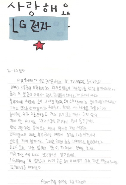 최근 LG전자는 서울 서대문구에 거주하는 초등학교 5학년 기채영 학생으로부터 손으로 직접 쓴 편지 한 통을 받았다.