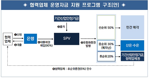 재원은 기간산업안정기금 1조원 출자를 통해 설립된 특수목적기구(SPV)가 시중 은행의 협력업체 대출 채권을 매입해 유동화 증권(P-CLO)을 발행하는 방식이다.