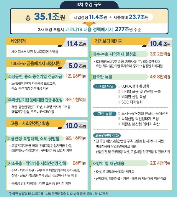 이번 3차 추경에는 고용안전망을 위한 고용안정 특별대책 이행 지원을 위한 9조1000억원, 내수·수출·지역경제 활성화를 위한 온누리상품권 1조원 추가 발행 등 3조2000억원, K-방역 산업 육성 등 2조4000억원 등의 예산이 추가 편성됐다.