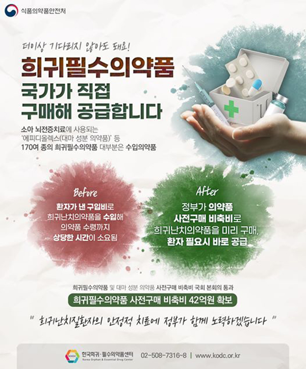 식품의약품안전처는 국내 희귀난치질환자의 안정적 치료를 위한 의약품 사전구매 비축비 42억원을 3차 추경(추가경정예산)을 통해 확보했다고 밝혔다.