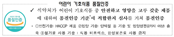 식품의약품안전처는 어린이 기호식품 품질인증 도안의 표시 방법을 개선하고 우수판매업소 시설 기준을 완화하는 ‘어린이 식생활안전관리 특별법’ 시행규칙 일부개정안을 8일부터 시행한다고 밝혔다.
