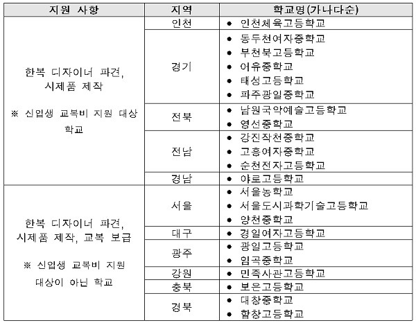 신입생 교복비 지원 대상 학교에는 한복 디자이너 파견과 시제품 제작을 지원하고 신입생 교복비 지원 대상이 아닌 학교에는 교복 보급까지 지원한다.