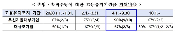 코로나19 사태 이후 정부는 당초 휴업·휴직수당의 50~67% 수준을 지원해 주고 있던 고용유지지원금을 최대 90%까지 상향 지급하는 특례를 신설한 바 있다.