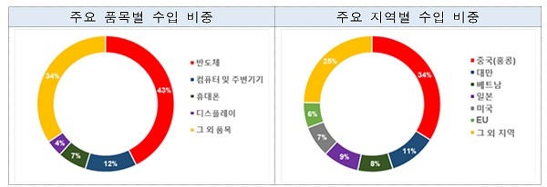 ICT 수입액은 전년 동월대비 4.8% 증가했으며 주요 수입 지역은 중국, 대만, 일본, 베트남, 미국, EU 등으로 나타났다.