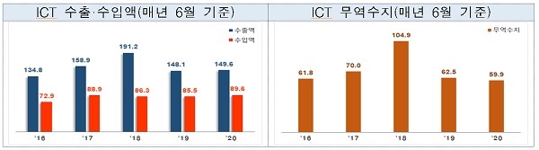 13일 산업통상자원부에 따르면 6월 ICT 수출액은 149억6000만달러로 전년 동기와 비교해 1.0% 증가했다. 수입 역시 전년 대비 4.8%가 증가한 89억6000만달러로 무역 수지는 59억9000만달러 흑자를 기록했다.