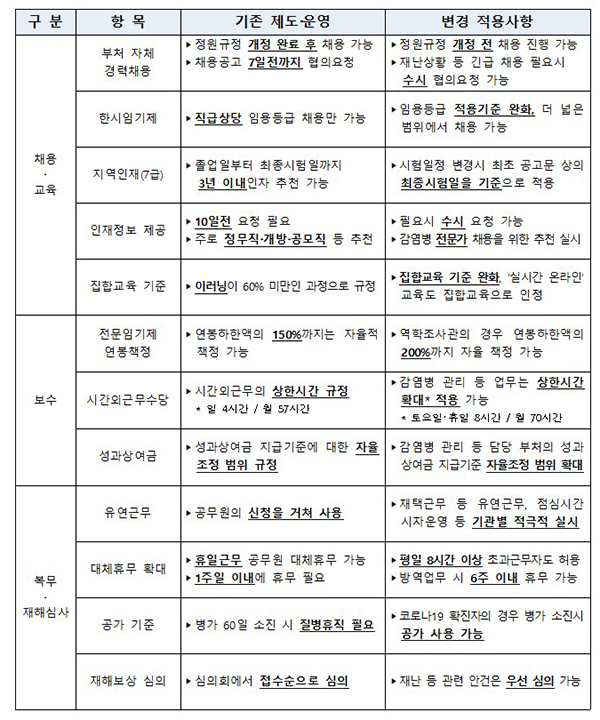 공고기간 단축은 재난상황 등 긴급한 필요가 있는 경우 인사처와 협의해 공고기간을 단축하고 채용을 빠르게 완료할 수 있도록 하는 ‘공무원임용시험령’ 개정 완료 후 적용된다.