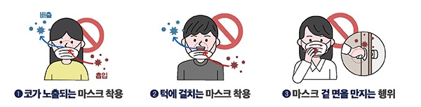 마스크 겉면을 만지는 행위도 이 곳에 묻어있는 바이러스 등이 손에 묻어 눈·코·입으로 전염 될 수 있는 만큼 마스크 겉면은 최대한 만지지 말고 마스크를 벗을 때도 끈만 잡고 벗어야 한다.