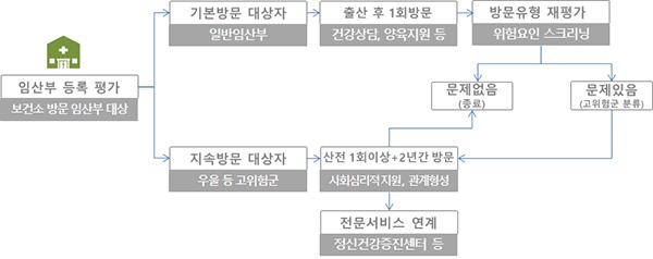 이후 간호사가 출산 후 8주 이내 1회 가정을 방문해 산모의 영양, 운동, 수면 등 기본적인 건강상담과 우울 평가, 정서적 지지, 신생아 성장발달 확인, 수유·육아환경 등 아기 돌보기에 관한 교육 등의 서비스를 제공한다.