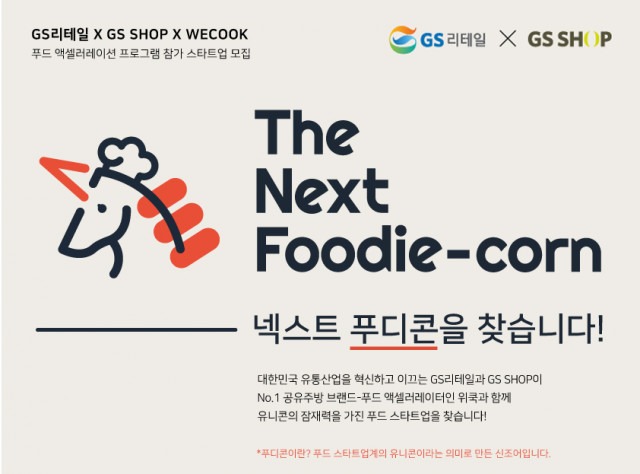 GS리테일과 GS홈쇼핑이 7월 27일부터 미래 동반성장을 위해 함께 할 푸드(Food) 제조 스타트업을 발굴 및 육성하는 프로그램 ‘넥스트 푸디콘(부제: 푸드계의 유니콘을 찾아서)’ 모집을 시작한다고 밝혔다.
