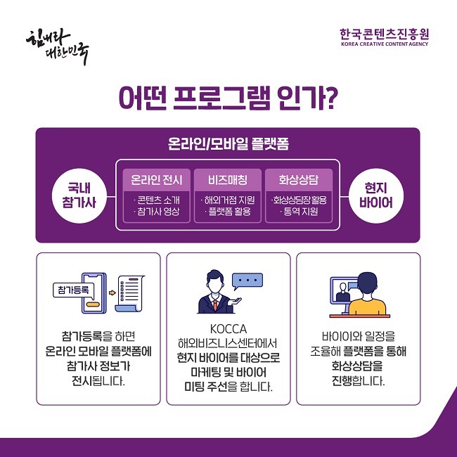 ‘글로벌 온라인 상시 비즈매칭 프로그램’은 포스트 코로나 시대 변화된 비즈니스 환경에 맞춰 국내 콘텐츠 기업이 온라인 플랫폼을 통해 시간과 장소에 구애받지 않고 해외바이어와 비즈니스를 추진할 수 있도록 설계됐다.