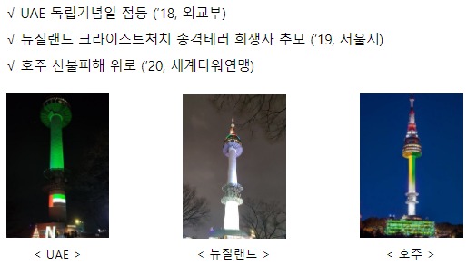 서울시는 지난해 3월 29일 뉴질랜드 크라이스트처치시 총격 테러 희생자 추모를 위한 점등 행사에 동참한 바 있고, 이밖에도 폴란드․라트비아․UAE 국경일 기념 점등식을 진행하기도 하는 등 국제사회의 여러 경조사에 점등행사를 활용해 동참해 왔다.