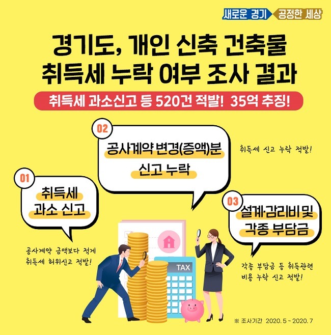 경기도는 지난 5월부터 7월까지 최근 2년간 개인이 신축한 건축물 4,139건에 대한 지방세 기획조사를 실시해 법령 위반사항 520건을 적발하고, 지방세 35억 원을 추징했다고 20일 밝혔다.