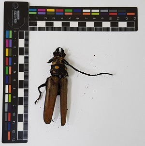 이번에 발견된 장수하늘소 성충은 조류에 의한 공격으로 몸통의 일부가 파손된 상태였다.