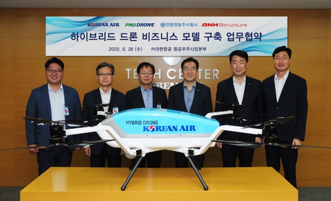 대한항공은 지난 8월 26일 부산 강서구 테크센터에서 이수근 대한항공 부사장, 강범수 피앤유드론 대표이사, 김용수 연합정밀 대표이사, 안현수 에이엔에이치스트럭쳐 대표이사 등이 참석한 가운데 하이브리드 드론 실증 및 운영사업을 위한 업무 협약서를 체결했다.
