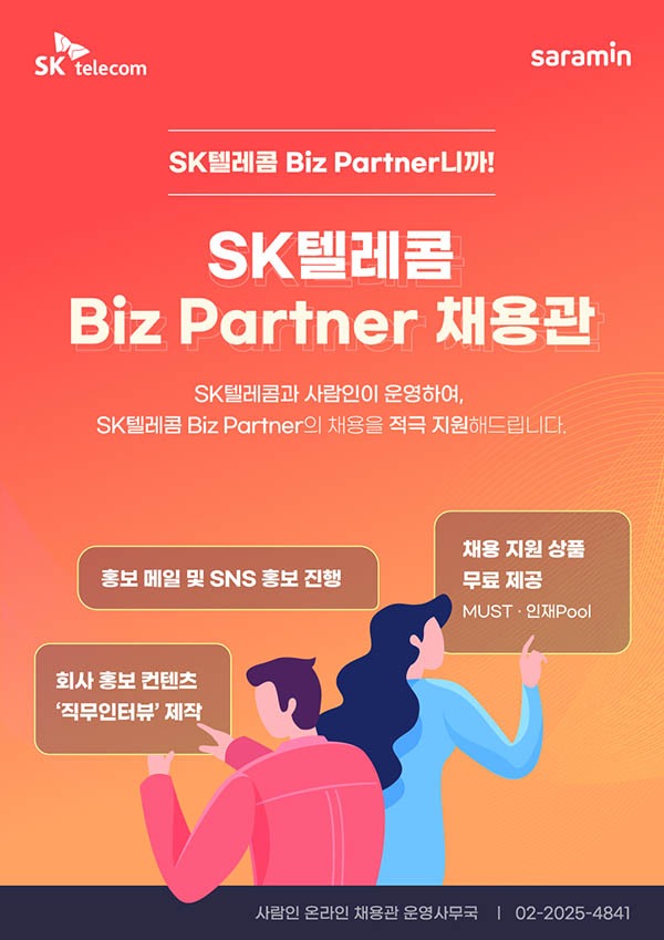 SK텔레콤은 9월 1일부터 11월 30일까지 3개월 간 온라인 채용사이트 ‘사람인’(www.saramin.co.kr) 메인화면에 ‘SKT 비즈파트너 채용관‘을 개설하고, 협력사의 인재 채용을 지원한다고 8월 31일 밝혔다.