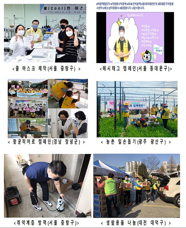 이밖에도 전국의 자원봉사단체와 센터는 코로나19 여파로 운영이 중단된 무료급식소를 대신해 기초수급자, 홀몸 어르신 등에게 대체식을 나누어 주고 도시락을 배달하는 활동을 꾸준히 전개해 오고 있다.