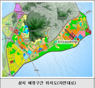 인천경제자유구역청은 영종하늘도시 사업시행자인 LH(한국토지주택공사)가 중심상업지역인(중구 중산동 1978번지) 자연대로의 중앙분리대 553m에 70개의 만국기 게양대를 설치하는 공사를 9월에 시작해, 올 12월 완공할 계획이다.