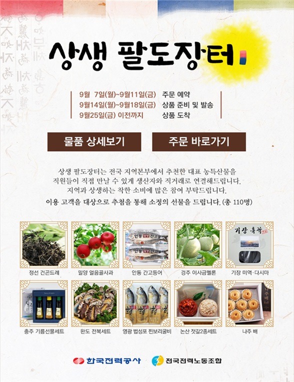앞서 한전은 2019년부터 총 8차례 ‘사회적경제 금요장터’를 통해 약 6천만원 이상의 판매수익을 올리며 지역 농특산물 소비 촉진에 적극 동참하였다.