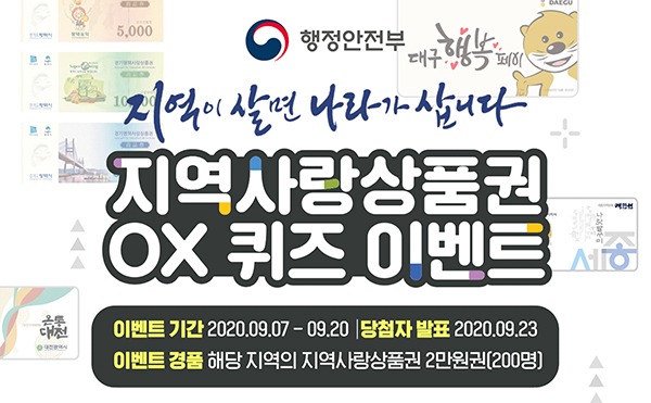 행정안전부는 다가오는 민족 대명절 추석을 맞이해 ‘지역사랑상품권’을 증정하는 이벤트를 20일까지 진행한다고 밝혔다.