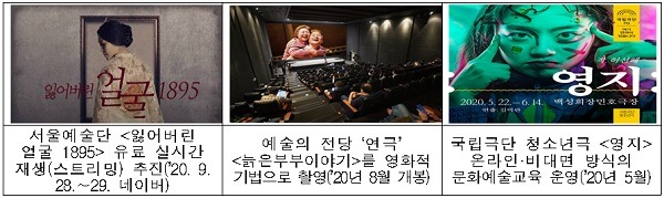 ‘예술의전당’은 실감형 기술과 결합한 공연을 영상화하고 ‘국립극장’은 국내외 주요 고화질 공연 영상을 온라인 장과 연계할 수 있는 판로를 개척한다. ‘국립극단’은 차별화된 관람경험을 제공하는 온라인 극장 개관을 추진한다.