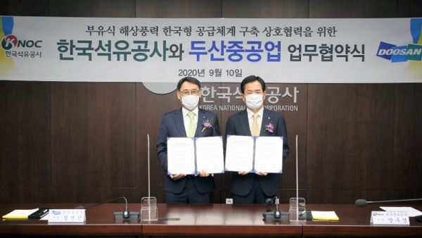 두산중공업은, 한국석유공사와 ‘동해1 부유식 해상풍력 발전사업 한국형 공급체계 구축 상호협력에 관한 협약(MOU)’을 체결했다고 10일 밝혔다. 이 날 한국석유공사 본사에서 진행된 협약식에는 한국석유공사 양수영 사장, 두산중공업 정연인 사장을 비롯한 양사 관계자들이 참석했다.