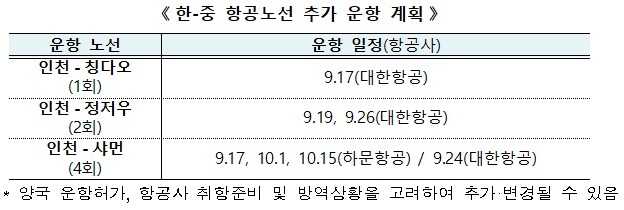 이번에 추가 운항 추진 중인 부정기 항공편 중에서 우선 중국의 칭다오, 정저우, 샤먼 등 3개 지역을 17일부터 총 7편 운항(모두 인천노선) 예정이며, 우리 국적사와 중국 항공사가 나누어 취항하게 된다.