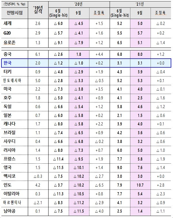 2020~2021년 성장률을 합산해 비교하더라도 우리나라는 +2.1%로 OECD 회원국 중 가장 높은 수준을 보이고 그 뒤를 터키(+1%)와 미국(+0.2%)이 이을 것으로 전망했다.