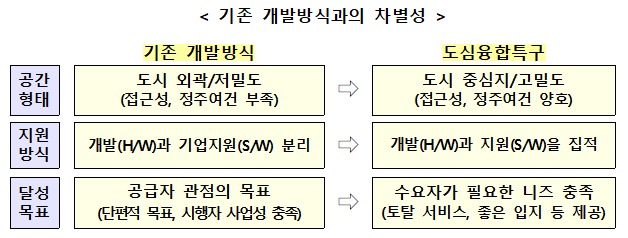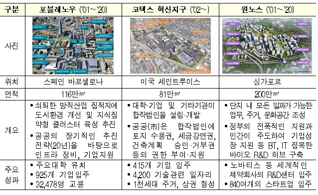 도심융합특구는 스페인 바르셀로나의 포블레노우, 미국 세인트루이스의 코텍스 혁신지구, 싱가포르의 원노스 지구와 같이 공공 또는 공공과 민간이 협업해 조성한 삶-일-여가(live-work-play)가 있는 혁신지구를 모델로 삼고 있다.