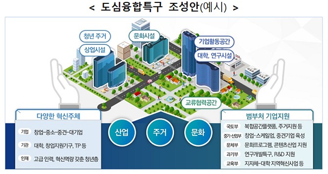 도심융합특구는 지방 대도시(광역시 5곳)의 도심에 기업·인재가 모일 수 있도록 ‘판교2밸리’와 같이 산업·주거·문화 등 우수한 복합 인프라를 갖춘 고밀도 혁신공간을 조성하는 사업이다.