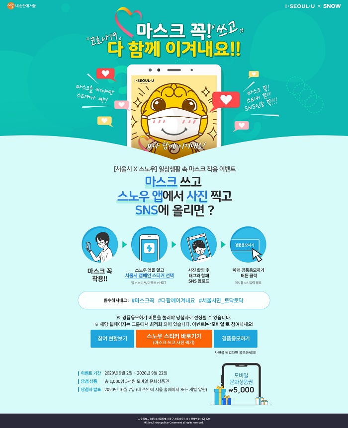 서울시 X 스노우, 마스크를 써야만 나타나는 코로나 극복 시민 응원 스티커 제작해 9월 2일~22일까지 캠페인 진행