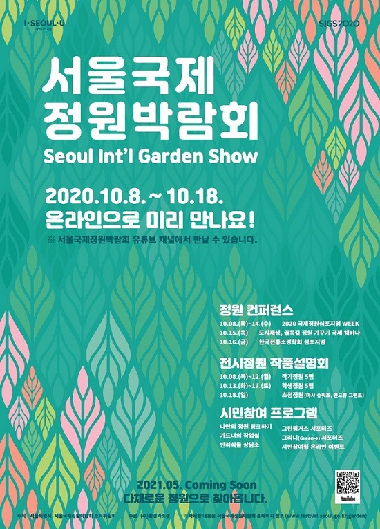 서울시는 오프라인으로 접하기 힘든 해외의 정원전문가들이 참여하는 ‘온라인 서울국제정원박람회(Virtual SIGS 2020)’를 10월 8일부터 10월 18일까지 11일 간 개최한다고 밝혔다.