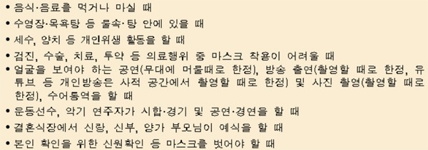 세면, 음식섭취, 수술 등 의료 행위를 할 때, 수영장·목욕탕 등 물속이나 탕 안에 있을 경우, 수어 통역·사진 촬영·방송 출연·공연·예식·신원 확인 등 얼굴을 보여야 하는 상황에서도 과태료를 부과하지 않는다.