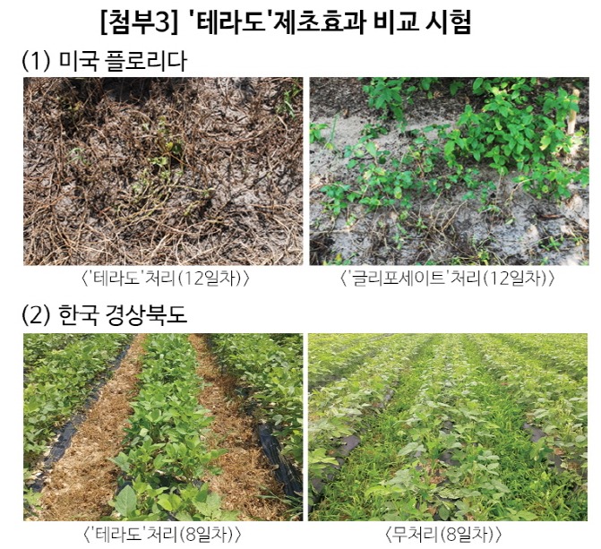 글리포세이트(Glyphosate)계 제초제를 오랫동안 지속적으로 사용해온 미국, 호주 등지에서는 이들 제초제에 내성을 갖는 잡초가 확산되면서 큰 문제가 되고 있다. 미국 환경보호청은 기존 제초제와 작용기작이 다른 '테라도'를 글리포세이트 저항성 잡초 방제에 효과적인 대체재로 손꼽았다. 또한 '테라도'의 신속한 잡초 방제 효과로 파종 작업이 편리해지고, 작물 생산량 증가에도 긍정적인 효과가 있을 것으로 기대했다.