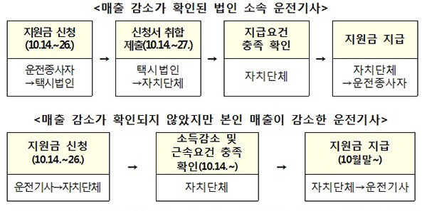 또한 같은 기간 동안 법인의 매출액은 감소하지 않았지만 본인 소득이 감소한 운전기사의 경우에는 신청서와 소득감소 증빙자료를 자치단체에 직접 제출하면 된다.