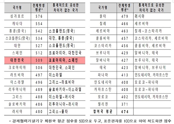 특히 인지적 평가에 대한 평균 점수에서 우리나라 학생들이 509점을 얻어 27개 참여국 전체의 평균 점수(474점)보다 35점 높은 것으로 밝혀졌다.