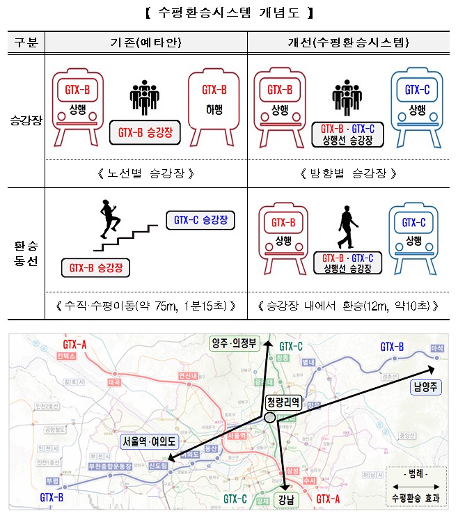 GTX B, C노선이 교차하는 청량리역은 노선간 별도의 이동 없이 동일 승강장에서 바로 환승할 수 있는 수평환승시스템을 구축해 수도권 대중교통의 골격인 GTX의 효과를 극대화할 계획이다.