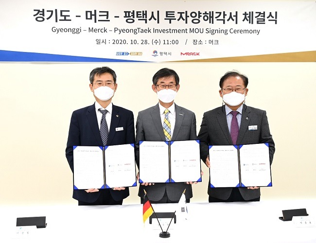 이용철 경기도 행정2부지사와 김우규 머크퍼포먼스머티리얼즈(주) 대표, 이종호 평택시 부시장은 28일 평택 머크 평택공장에서 이런 내용을 담은 투자협약을 체결하고 도내 기업 및 학교와 상생협력을 다짐했다.