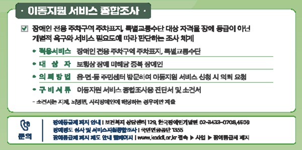 이에 따라 장애인전용주차구역 주차표지 발급 및 특별교통수단 등 ‘이동지원 서비스’까지 확대하는 ‘서비스 지원 종합조사’ 개편 2단계를 시행할 방침이다.