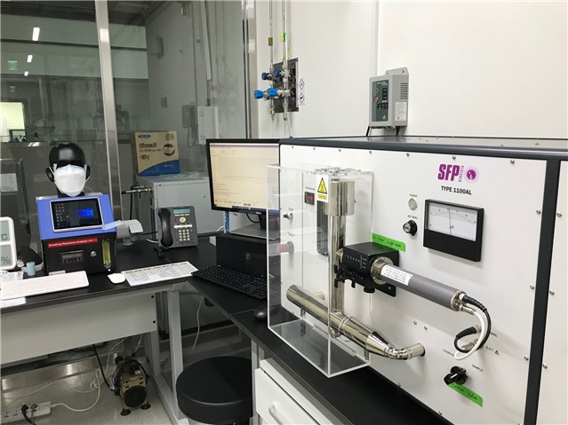 분진포집효율은 실험환경에서 분진을 만들어 마스크 필터를 통과시킨 후 통과된 분진을 측정하는 방법으로, 분진역할을 하는 물질에 따라 염화나트륨(에어로졸 입자)과 파라핀오일(미스트 입자)을 측정한다.