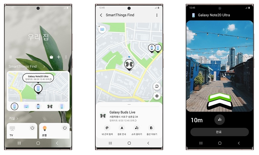 ‘스마트싱스 파인드’에 등록된 기기 위치 정보는 실시간으로 업데이트된다. 등록 기기를 분실했을 경우, 스마트싱스 앱을 열고 찾고자 하는 기기를 선택하면 해당 단말의 위치가 지도 위에 표기된다. 사용자가 분실 기기에 접근했을 때 알림음이 울리게 해 그 소리를 듣고 기기를 찾을 수도 있다. UWB 기술이 탑재된 단말 사용자라면 증강현실(AR) 기반 ‘서치 니어바이(Search Nearby)’ 기능을 활용, 분실 단말의 위치를 컬러 그래픽으로 확인하는 것도 가능하다.