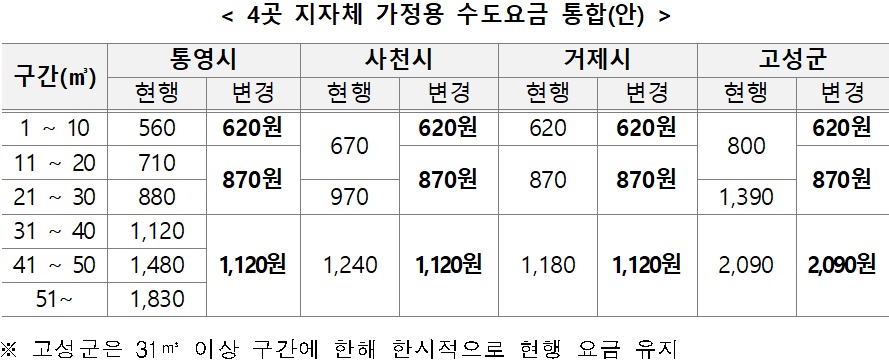 4곳 지자체는 가정용 수도요금 부과체계를 최대 6단계에서 3단계(월 1∼10㎥, 11∼30㎥ 및 31㎥이상)로 축소·단일화하고, 구간별 부과요금 단가를 동일 요금으로 체계를 개선한다.