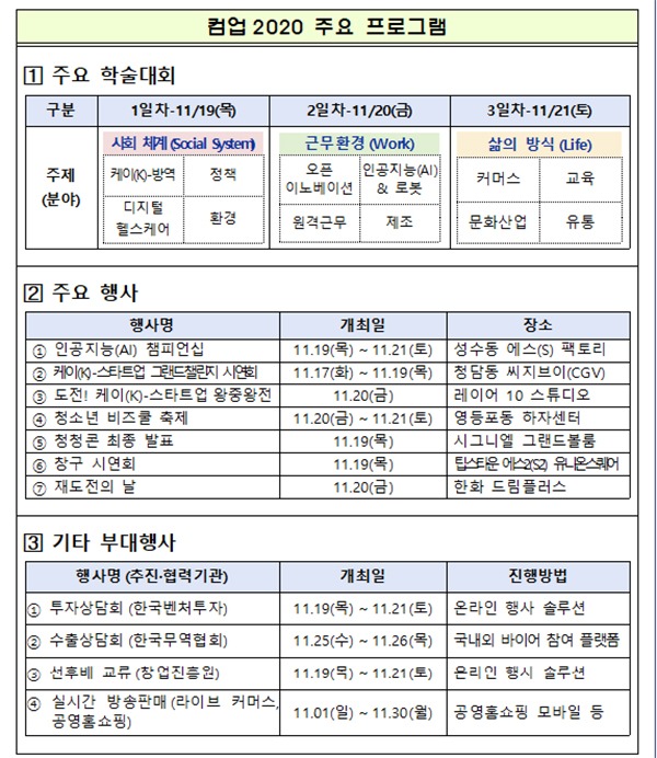 컴업 2020의 주요 프로그램 중 하나로 인공지능(AI) 챔피언십, K-스타트업 그랜드 챌린지 등 한국을 대표하는 창업지원 정책들과 컴업 2020을 연계해 동시에 개최한다.